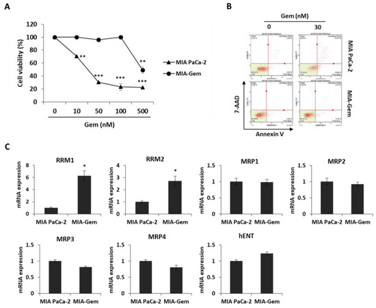 To establish MIA-Gem cells, the half maximal inhibitory concentration (IC50) of Gem at 72 h was determined using the WST-1 reagent. MIA PaCa-2 cells were exposed to IC50 of Gem for 72 h, and then grown until 80% full in fresh medium without Gem. During subculture, MIA PaCa-2 cells were exposed to gradually increasing concentrations of GEM from 30 to 500 nM for 8 months.