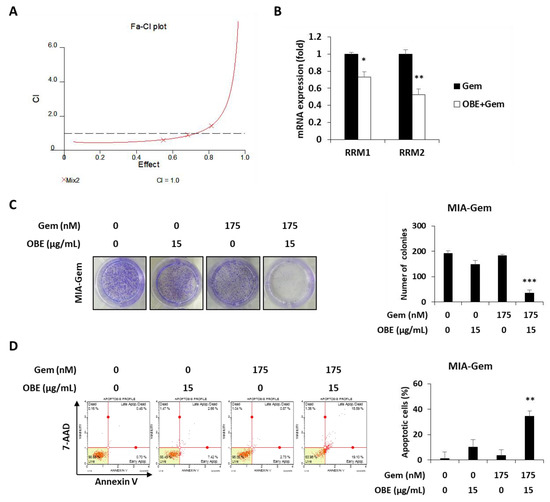 Combination therapy, a treatment combining two or more drugs, has been commonly used to improve overall survival of PC patients [23]. It was investigated whether there is a synergistic effect of OBE in combination with Gem. Based on CI values, 15 μg/mL of OBE plus 175 nM of Gem combination showed better synergistic effect than the other concentrations of OBE and Gem together (Figure 6A and Table 1). It was hypothesized that this synergistic effect of OBE and Gem combination on Gem-resistant PC cells might be due to the regulation of RRM1 and RRM2 expressions. As expected, treatment with OBE and Gem combination significantly decreased expression of RRM1 and RRM2 in MIA-Gem cells (Figure 6B). Moreover, the synergistic effect of OBE with Gem combination was confirmed on MIA-Gem cells. Combinatorial treatment revealed higher inhibitory effect on colony formation and apoptosis in MIA-Gem cells than with OBE or Gem treatment alone (Figure 6C,D). These results demonstrated that the OBE and Gem combination has synergistic effect on the viability of Gem-resistant PC cells.