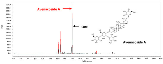 Oat bran contains 16 kinds of steroidal saponins [38]. Among these compounds, avenacoside A has been shown to inhibit the growth of HCT116 and HT29 human colon cancer cells and decrease the production of intracellular IL-2 in activated T cells [38,39]. Since avenacoside A was found in OBE by UPLC analysis (Figure 7), it is hypothesized that the anti-proliferative effect of OBE on PC cells might be due to avenacoside A. The content of avenacoside A in OBE was 1.075 mg/g. Further studies are needed that investigate the inhibitory effect of OBE at proper concentrations on survival and Gem-resistance in PC cells.