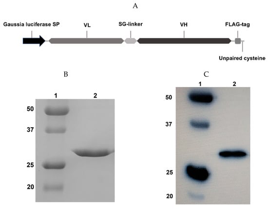 Design and expression of the scFv fragment 14.18. (A) Structure of the scFv fragment 14.18. (B) 12% reducing sodium dodecyl sulfate polyacrylamide gel electrophoresis (SDS-PAGE); 1, molecular weight protein markers; 2, scFv fragment 14.18. (C) Western blot analysis; the membrane was incubated with HRP-labelled anti-FLAG antibodies (1:6000). Visualization with 1-Step Ultra TMB-Blotting Solution.