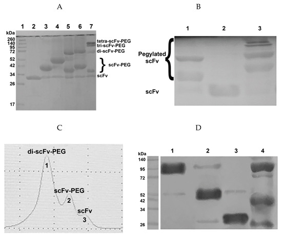 For each pegylation reaction of the scFv fragment with the corresponding maleimide-activated polyethylene glycol variant, the molar ratio of the components and the reaction time were optimized. The optimal protein:PEG ratios for PEG-maleimide, PEG-di-maleimide, and PEG-tetra-maleimide in the given reaction conditions (see Materials and Methods) are 1:10, 1:2, and 1:1, respectively. After optimization of the pegylation conditions, the reaction efficiency constituted at least 80% (Figure 3A). Proteins conjugated with high molecular weight PEG molecules are characterized by anomalous mobility in polyacrylamide gel compared to unmodified proteins, which was most noticeable for PEG-di-maleimide 40 kDa (data not shown). In the case of protein conjugation with lower molecular weight PEG molecules, the reaction products corresponded to the calculated (expected) molecular weights of pegylated mono-, di-, and tetra-scFv fragments (Figure 3A).