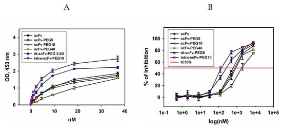 In order to confirm the data obtained in direct ELISA and to assess the IC50% values, competitive ELISA was carried out. IC50% was calculated as the respective scFv fragment conjugate concentration at which 50% inhibition of the binding of full-length GD2-specific antibodies to ganglioside GD2 takes place during competitive interaction. For carrying out competitive ELISA, biotinylated GD2-specific antibodies 14G2a at a concentration of 50% saturation (half maximal effective concentration (EC50%)), which was 0.33 nM (data not shown), were mixed and incubated with serial dilutions of scFv fragments. After incubation with streptavidin-HRP and reaction development, IC50% was determined for each variant of scFv fragment conjugates of GD2-specific antibodies (Figure 4B). The results obtained in the competitive ELISA confirmed the patterns found in direct ELISA. The modified scFv fragments differed in their ability to inhibit the interaction of full-length antibodies with ganglioside GD2. The minimal IC50% (half maximal inhibitory concentration) values were observed for pegylated di- and tetra-scFv fragments and constituted 143 ± 8 nM and 262 ± 11 nM, respectively. The IC50% values for monomeric intact and pegylated antibody fragments were significantly higher and constituted 620 ± 14 nM, 776 ± 20 nM, and 880 ± 17 nM for intact scFv fragments, scFv-PEG 5 kDa, and scFv-PEG 10 kDa, respectively. IC50% for scFv fragments pegylated with PEG-maleimide 40 kDa was even higher, in the micromolar range. It is likely that in this case the PEG molecule with large molecular weight and branched structure partially masked the interaction of the antibody fragment with ganglioside GD2. The obtained data demonstrate that pegylation of intact scFv fragments with monovalent PEG-maleimides of increasing molecular weight leads to a non-linear decrease in the binding with the antigen, whereas multimerization of the scFv fragments by polyvalent PEG-maleimides substantially increases this binding.