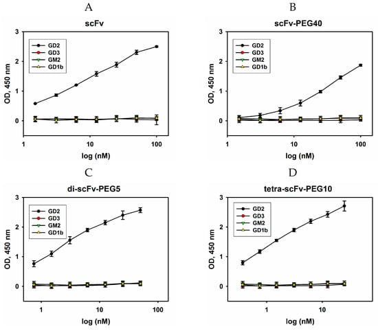 Evaluation of cross-reactivity of intact and modified scFv fragments in direct ELISA. GD2, GD3, GM2, and GD1b gangliosides were adsorbed on the plate; serial dilutions of intact scFv fragments (A), scFv-PEG 40 kDa (B), di-scFv-PEG 5 kDa (C), and tetra-scFv-PEG 10 kDa (D) were added to the wells. After incubation with HRP-labelled anti-FLAG antibodies (1:6000), the reaction was developed by Ultra TMB-ELISA Substrate Solution. Data are represented as mean ± SEM.