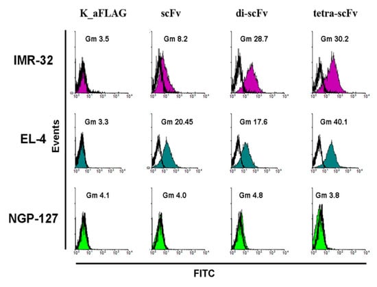 Flow cytometry analysis. Incubation of IMR-32, EL-4, and NGP-127 cell lines with intact scFv fragments, di-scFv-PEG, and tetra-scFv-PEG, followed by staining with fluorescein-5-isothiocyanate (FITC)-labelled anti-FLAG antibodies (1:500). K_aFLAG—Control cells stained only with FITC-labelled anti-FLAG antibodies.