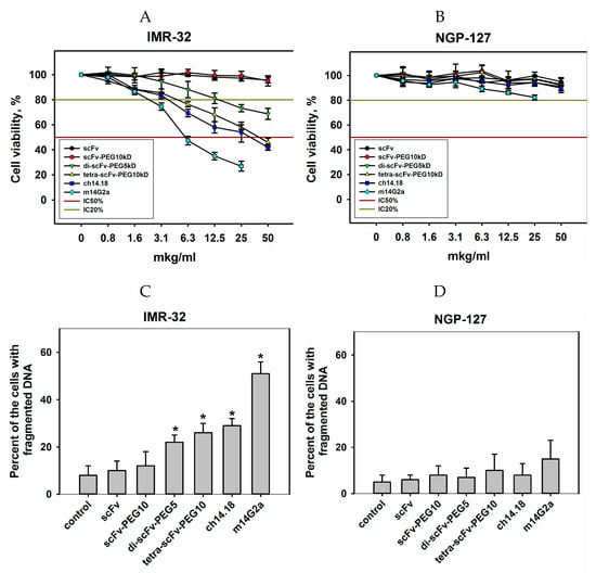 A number of works have provided evidence that different GD2-specific antibodies are able to induce direct cell death in GD2-positive cells [23,24,25]. In this regard, it was particularly interesting for us to evaluate and compare the direct cytotoxic effects of intact and modified scFv fragments of GD2-specific antibodies. The effects of the antibody fragment conjugates on the viability of GD2-positive IMR-32 and GD2-negative NGP-127 human neuroblastoma cell lines were evaluated in MTT (3-[[4,5]-dimethylthiazol-2-yl]-2,5-diphenyltetrazolium bromide) and propidium iodide (PI) assays (Figure 7).