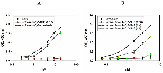 Direct ELISA. Ganglioside GD2 was adsorbed on the plate; serial dilutions of scFv fragments labelled with Sulfo-Cy5-NHS (protein:dye ratio = 1:10) or Sulfo-Cy5-maleimide (A), or serial dilutions of tetra-scFv fragments labelled with Sulfo-Cy5-NHS (protein:dye ratios = 1:10, 1:4, or 1:2) (B) were added to the wells. After incubation with HRP-labelled anti-FLAG antibodies (1:6000), the reaction was developed by Ultra TMB-ELISA Substrate Solution. Data are represented as mean ± SEM.