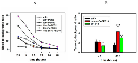 For evaluating the circulation time of the molecules in the blood, fluorescently labelled scFv fragment conjugates (150 μg/mouse or 7.5 mg/kg) were intravenously injected into C57BL/6 mice. At certain time points, aliquots of blood were collected, and fluorescence was evaluated for each type of the injected molecule. Figure 9A shows the ratios of the mean fluorescence intensity of Sulfo-Cy5-labelled scFv fragment conjugates in blood plasma to the mean fluorescence intensity of blood plasma of intact mice (blood-to-background (B-T-B) ratio) over time. It can be seen that already at 2.5 h post-injection, a small amount of monomeric non-pegylated scFv fragments remains in the blood and the B-T-B ratio is less than 4. Pegylation considerably increases the circulation time of the scFv fragments in the blood; moreover, circulation time directly depends on the molecular weight of the attached PEG molecule. For example, 2.5 h post-injection, the pegylated monomer scFv-PEG 10 kDa had a B-T-B ratio two times higher than that for scFv-PEG 5 kDa. Similarly, 5 h post-injection, the B-T-B ratio for di-scFv-PEG 5 kDa was 1.7 times higher than for di-scFv-PEG 2 kDa. Multimerization of the fragments further increases the circulation time. While the difference in circulation time for scFv-PEG 5 kDa and di-scFv-PEG 5 kDa was not very significant, and the biggest difference in the B-T-B ratio between mono-scFv and di-scFv fragments was observed 5 and 7 h post-injection (12.3211 ± 0.3 vs. 6.8196 ± 0.7 and 7.3907 ± 0.9 vs. 3.1314 ± 0.6, respectively), the circulation time of tetra-scFv-PEG 10 kDa was significantly higher than that of scFv-PEG 10 kDa, which was observed for B-T-B ratios at all time points. Moreover, a sufficiently high concentration of pegylated tetra-scFv fragments in the blood was maintained even 48 h post-injection; the B-T-B ratio was 3.4297 ± 0.5 for the tetra-scFv-PEG 10 kDa vs. 1.2621 ± 0.17 for the scFv-PEG 10 kDa. Thus, both pegylation and multimerization substantially increase the circulation time of scFv fragments in the blood, and the increase in circulation time directly correlates with the molecular weight of PEG (Figure 9A). This is probably the result of the decrease of renal clearance of the constructs. In preliminary biodistribution experiments, we saw a decrease in the accumulation of tetrameric scFv in the kidneys relative to monomeric scFv by approximately 2.5–3 times and a slight increase in liver accumulation