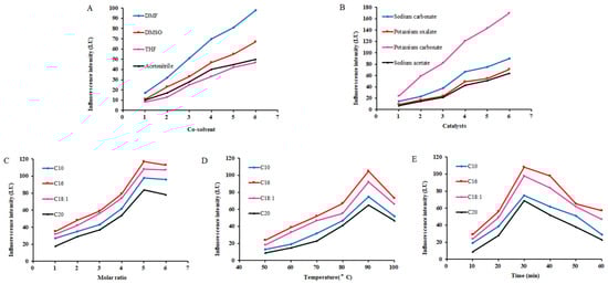 Optimization of derivatization conditions ((A): Co-solvent; (B): catalysts; (C): molar ratio; (D): temperature; (E): time).