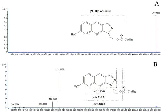 MS spectra of the representative oleic acid derivative and fragmentation pattern of the protonated molecular ion. (A) molecular ion peak of the oleic acid derivative. (B) fragmentation pattern of protonated molecular ion