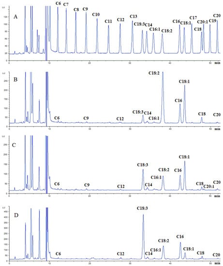 Representative chromatograms for standards (A), fatty acid derivatives in seeds of Nitraria tangutorum Bobr. (B), fatty acid derivatives in peel and pulp of Nitraria tangutorum Bobr. (C) and fatty acid derivatives in leaves of Nitraria tangutorum Bobr. (D).