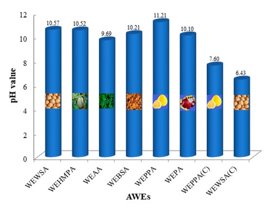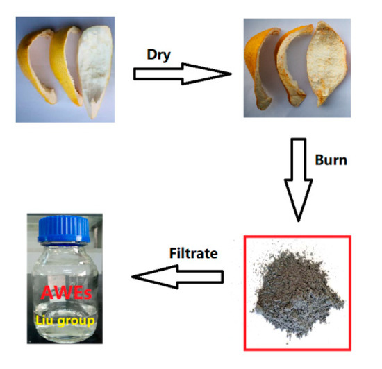 The AWEs used in this paper were prepared according to the literature methods [,,,,,,,,,,,,,]: (i) drying the agro-waste; (ii) burning the dried agro-waste to get the ash; (iii) suspension and stirring of the ash in distilled water, followed by filtration with sintered glass crucible and collection filtrate (Figure 1). For a comparison with the reported methods, we prepared two kinds of AWEs using the ash obtained by high-temperature calcination and marked them as WEPPA(C) and WEWSA(C). The pH values of AWEs were measured by the pH meter, as shown in Figure 2. Among them, WEPPA had the highest basicity (pH = 11.21), while high-temperature calcination led to an obvious decrease in basicity (pH: 10.57 versus 6.43, 11.21 versus 7.60).