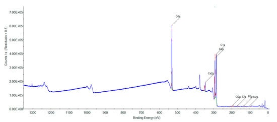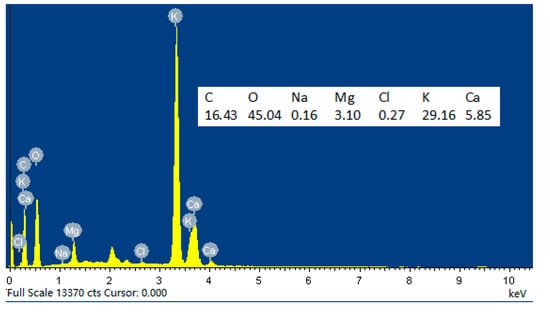 To illustrate the origin of the basicity and analyze the kinds and concentrations of the remaining elements, the pomelo peel ash was characterized by inductively coupled plasma atomic emission spectroscopy (ICP-AES) (Table 1), energy-dispersive X-ray (EDX) (Figure 3), and X-ray photoelectron spectroscopy (XPS) (Figure 4 and Table 2, respectively. The high element concentrations of K, Ca, Mg, and Na were revealed by the ICP-AES analysis. That was why the aqueous pomelo peel ash had strong basicity. The EDX and XPS spectrums jointly revealed an abundance of the oxides and/or carbonates of K, Ca, Mg, and Na.