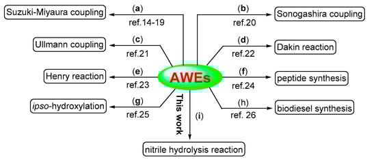 Nowadays, with the aggravation of the environmental crisis, there is an increasing requirement for sustainable chemical technologies from academia and industry. Significant advances have been made in the exploitation of greener processes from renewable feedstocks [,,]. Volatile organic solvents (VOCs) are recognized as one of the major contributors to the generation of bulky chemical waste. A range of green solvents such as ionic liquids [,], deep eutectic solvents [], super critical fluids [,,], and biosolvents [], fluorinated solvents [], water [], and so on have been developed as alternative solutions. In recent years, a water extract of agro-waste ash (AWEs) has emerged as a novel green reaction medium [] and has been successfully employed in transition-metal-catalyzed cross-coupling reactions (Suzuki–Miyaura [,,,,,], Sonogashira [], Ullmann []), Dakin reaction [], Henry reaction [], peptide synthesis [], ipso-hydroxylation [], and biodiesel synthesis [] (Scheme 1a–h)). AWEs, easily prepared from various renewable agricultural waste products, can be a rich source of raw materials and play multiple roles, including those of the water, in situ base, reductant, and so forth.