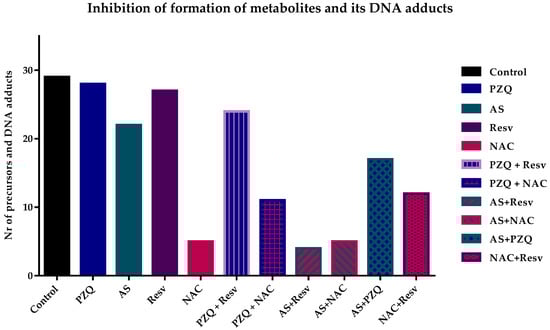 Additionally, we evaluated the inhibitory effect of the formation of the combinations of a drug plus drug (AS + PZQ), and antioxidant plus antioxidant (Resv + NAC). The combination of AS + PZQ achieved better results than drugs alone inhibiting the formation of a higher number of compounds (13), either precursor’s metabolites or DNA adducts, in comparison to the drugs alone (Figure 2). Concerning the combination of NAC + Resv, it was possible to observe a decrease of precursors and DNA adducts more pronounced than Resv alone. However, the inhibitory effect induced by this combination was lower when compared to NAC alone. Nevertheless, the combination NAC + Resv was more efficient than AS + PZQ possibly due to the effect induced by NAC since this antioxidant alone inhibited the formation of most precursors’ metabolites and/or DNA adducts (Figure 2).