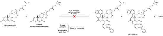 Recently we explored the generation of some of the metabolites and related DNA-adducts previously identified in the context of opisthorchiasis and schistosomiasis and their infection-associated cancers. In that study, we confirmed the ability of glycocholic acid and taurochenodeoxycholate sodium to interact with DNA leading to the formation of DNA adducts []. Their formation might be independent of the parasite CYP450, nonetheless, in the presence of isoforms either metabolites or DNA adducts were also detected. Based on the same methodology, here we synthesized metabolites precursors and DNA adducts of glycocholic acid and taurochenodeoxycholate sodium in presence of isoforms of CYP450. Despite that their formation may be independent of CYP450, this family of enzymes might play a role in the metabolism of drugs and interfere with their activity [,]. Through LC-MS/MS analysis we detected several oxidized forms of starting compounds and also their DNA-adducts that were originated during the reaction. The metabolites precursors and their DNA adducts detected here were similar to those observed in our previous work [].