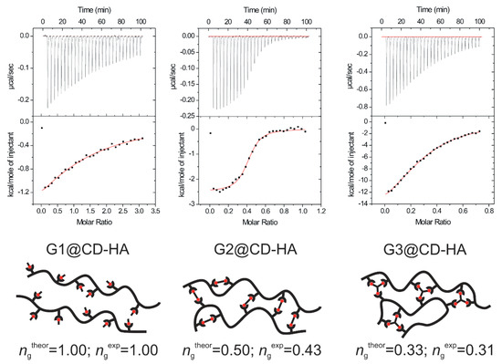 We started our examination of the supramolecular properties of CD-HA by isothermal titration calorimetry (ITC) with the single-site guest G1 (for structure, see Figure 1). Since the chemical nature of guest G1 is well-defined and non-hygroscopic, it can be used as a standard to allow us to determine the actual concentration of available CD units. It was previously demonstrated that the guest G1 forms a 1:1 complex with natural β-CD with a sufficiently high binding constant [34] to allow for the unambiguous analysis of titration data, namely, the stoichiometric parameter n, even at millimolar concentrations of the supramolecular components. Therefore, we performed an ITC titration of the CD-HA polymer with G1 and calculated the actual concentration of CD units using the abovementioned parameter n from ITC and the degree of substitution, which was previously obtained by integrating the 1H-NMR spectrum. This concentration value was used as the input concentration of CD for the data processing of further titrations of CD-HA with G2 and G3. Figure 2 clearly shows that relative to guest G1, an equivalency point was reached after the addition of one-half and one-third of the molar quantities of G2 and G3, respectively (see Table 1 for ITC data). This means that, for instance, ditopic guest G2 employs both its binding sites to saturate the CD units of CD-HA to form a supramolecular network, as depicted in Figure 2.