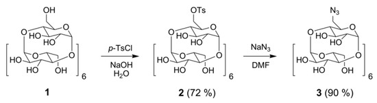 Compound 2 (0.50 g, 0.38 mmol) was suspended in dimethylformamide (DMF), and the mixture was heated at 80 °C for 30 min [32]. Subsequently, NaN3 (0.12 g, 1.84 mmol) was slowly added to the solution, and the reaction mixture was stirred for 24 h at 80 °C. Afterwards, the crude product was precipitated by the addition of acetone. The colorless precipitate was collected by suction and dried in vacuum at 60 °C to yield 0.40 g (90%) of monoazidocyclodextrin. M.p. = 208–210 °C.