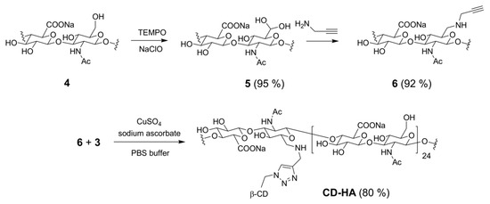 Natural hyaluronan (4) was oxidized with 2,2,6,6-tetramethyl-4-acetamidopiperidine-1-oxyl (4-acetamide-TEMPO) [33] using sodium hypochlorite as a primary oxidant to produce aldehyde moieties (hydrated form of product (5) is shown in Scheme 2). Oxidation occurred at the C6-OH position, and the oxidized HA was grafted with primary amines carrying alkyne groups via Schiff imine intermediate mediation to produce modified hyaluronan (6). A new CD-HA polymer was prepared via the 1,3-dipolar cycloaddition between monoazido-CD and the propargyl derivative of HA. The coupling between monoazido-CD and the alkyne-terminated derivative of HA was successfully performed in 1 mM PBS at ambient temperature (Scheme 2).