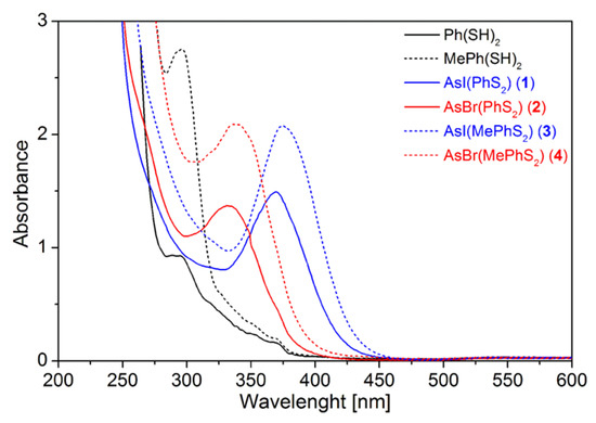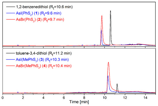 Four new arsenic(III) complexes were obtained as orange (1 and 3) or yellow (2 and 4) crystals in moderate yields (40–57%) via the reaction of two different dithiol ligands (1,2-benzenedithiol (Ph(SH)2) and toluene-3,4-dithiol (MePh(SH)2)) and arsenic(III) compounds (AsBr3 and AsI3) in refluxing chloroform solutions. Scheme 1 shows a simplified reaction pathway of the prepared compounds. The synthesis of these compounds was inspired by the methods described in ref [25]. All complexes crystalized quickly, typically overnight and their structures confirmed using common methods (single-crystal X-ray diffraction (scXRD), elemental analysis (EA), electrospray ionization-mass spectrometry (ESI-MS), Fourier transform infrared spectroscopy (FT-IR), ultraviolet-visible (UV-Vis) spectroscopy, nuclear magnetic resonance (NMR)). High-performance liquid chromatography (HPLC) reference peaks were also determined for every compound (Figure 1). The retention times of 1–4 differ from the free dithiols, so the reaction progress is easy to control via this simple method.