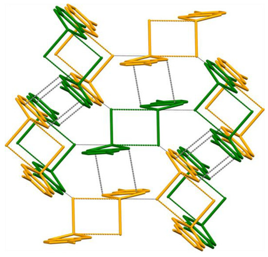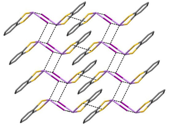 The main motif in all presented crystal structures is a dimeric fragment [AsX(LS2)]2 (X = I or Br, L = MePh or Ph). Within these dimeric units the molecules are stabilized through four-center [AsX]2 interactions. Compound 1 has a crystal structure consisting of chains along the crystallographic axis formed by the repetition of one [AsI(PhS2)]2 fragment (Figure 3) which is stabilized through intra-dimer As···I interactions of 3.607(1) Å. The dimers are further linked by additional As···I contacts of 3.518(1) Å. All these intermolecular As···I contacts are shorter than the sum of the van der Waals radii of arsenic and iodine (3.83 Å) [30]. The shortest contacts between neighboring chains in 1 correspond to the S2···S2 distances of 3.496(2) Å. Compared with the other complexes, compound 2 crystallizes forming a surprisingly large unit cell which consists of 13 crystallographically independent molecules in the asymmetric unit (Table 2 and Figure 4). Moreover, according to the Cambridge Structural Database, there is a relatively small number of structures with such a high number of molecules per asymmetric unit (Z’) with only 30 different structures for Z’ ≥ 13 reported to date [31]. The remaining compounds possess only one molecule in the asymmetric part. Similarly to compound 2, its chlorido analogue also contains a rare high Z’ structure with 17 molecules in the asymmetric unit [24]. The 13 molecules in compound 2 form 7 crystallographically different dimers through intra-dimer As···Br contacts in the range 3.380(1)–3.586(1) Å. Only one of these units is constructed from two of the same molecules containing As1B atoms. All dimers are held together by additional As···Br distances remaining in the range 3.465(2)–3.656(2) Å. These inter-dimer As···Br contacts are usually slightly longer than the intra-dimer distances. Nevertheless, all aforementioned distances are shorter than the sum of the van der Waals radii (3.68 Å) [30]. Additionally, some As···S contacts (3.567(2)–3.642(2) Å) between molecules of compound 2 are very close to the sum of the respective van der Waals radii (3.65 Å) [30]. The molecular packing in compounds 3 and 4 is essentially the same and consists of dimeric units arranged into a three dimensional net (Figure 5) with similar intra- [3.777(1) (As···I) or 3.698(1) Å (As···Br)] and inter-dimer [3.782(1) (As···I) or 3.714(1) Å (As···Br)] contacts, that remain very close to the sum of the respective van der Waals radii [30]. In addition, the molecules are stabilized by S···C contacts of 3.499(6) and 3.546(2) Å (for compounds 3 and 4, respectively) between the adjacent chelating rings. The shortest distances between neighboring arsenic atoms in 1 (3.922(1) Å) and 2 (mean 3.945(2) Å; range 3.847(2)–4.004(2)) lay outside the dimers. By contrast, the shortest As···As contacts for compound 3 (4.645(1) Å) and 4 (4.376(1) Å) are placed within the dimeric entities. All these distances fall beyond twice the van der Waals radius of arsenic (3.70 Å) [30].