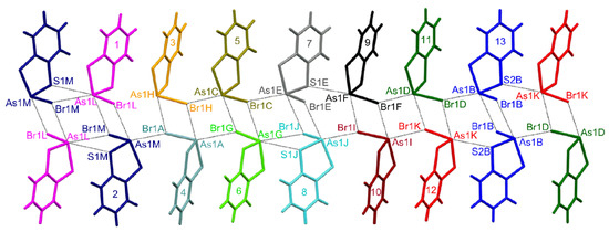 Fragment of a chain in compound 2 showing As···Br and As···S close contacts. Molecules are presented in different colors to highlight the 13 crystalographically independent molecules in the asymmetric unit.