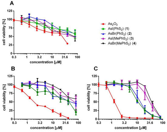An important accept of these arsenic complexes should be their comparative mode of action to As2O3, which would have a smaller influence on myocardial function. In our studies we examined the potency of arsenic(III) compounds 1–4, and arsenic trioxide as an anticancer reference agent, on cell growth of acute promyelocytic leukemia cells, NB4. As shown in Figure 9, all compounds as well as As2O3 induced cytotoxicity in a time and dose-dependent manner. Our results demonstrate that the viability of the cells treated with compounds 1–4 is higher than the viability of cells exposed for As2O3. Furthermore, based on the cytotoxicity data obtained, after 48 h treatment of the cancer cells, the IC50 values were determined. In comparison to the literature, the NB4 cells are relatively sensitive toward As2O3. Moreover, the estimated IC50 value (1.43 µM) is below clinically tolerable doses [36] (Table 5). Our synthesized anticancer agents 1–4 exhibited lower cytotoxicity (about 7-fold lower for compounds 1–2 and nearly 28-fold lower for compounds 3–4) in comparison to arsenic trioxide. The differences of NB4 cells in sensitivity to synthesized compounds and As2O3 could be explained by their structural differences. The addition of a methyl group to the benzene ring (3–4 molecules) causes lower reduction in viability of promyelocytic leukemia cells in comparison to compounds 1–2. Moreover, the presence of Br− or I− anions in the structures did not influence the cytotoxicity. However, all newly prepared dithiolato arsenic(III) compounds inhibited cell proliferation, which is important for future investigations of potential applications in radionuclide cancer therapy. Research of these compounds creates new possibilities to connect arsenic with targeting biomolecules and apply similar compounds for nuclear medicine using radioactive arsenic isotopes.