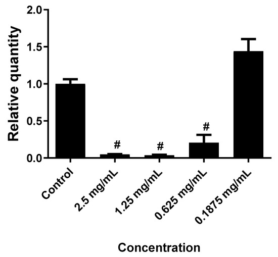 The effect of S. viticina EO on the cytotoxicity of HeLa cells. Results were depicted as relative quantities (RQs) compared to the control (only media). # Where P < 0.0001. Error bars represent SD.