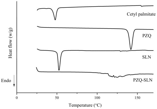 DSC technique has been widely used to obtain information about the purity of the standard reference; thermal transitions reflect the physical and chemical processes that are associated with a release or absorption of heat. Such transitions include melting, glass transition, polymorph conversion, crystallization, desolvation, dehydration, and chemical reactions [19]. Furthermore, DSC measures the changes that take place in a material with a change in temperature. Such changes are monitored by measuring the heat flow associated with the heating of a sample comparing it to the reference while they are subjected to the same controlled temperature program. The DSC thermograms of PZQ-SLN, SLN, PZQ, and cetyl palmitate are shown in Figure 1.