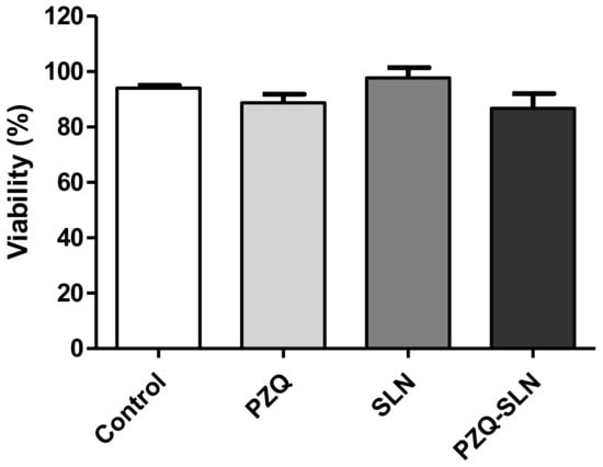 In vitro cytotoxicity was performed using human fibroblast L2929 as a cellular model. As reported in the scientific literature, although the lipids and surfactants used for the production of SLNs are of GRAS status, the cytotoxicity of these raw materials is dependent on the concentration and type of cell model. The administration route is also decisive to set the limits of acceptance. Besides the raw materials, the cytotoxicity of SLNs is dependent on the size and surface properties, as well as on the concentration of the particles in contact with the cells. The cytotoxicity profile of both blank and PZQ-SLNs should be obtained. The data are shown as a percent of cellular viability (Figure 4). The cell viability results demonstrate that free PZQ did not kill normal human fibroblasts. Indeed, cellular viability was greater than 88%. Moreover, blank SLNs (97.78%) and PZQ-SLNs (86.77%) also did not show any toxicological activity. The results indicate the safety and biocompatibility of both SLNs and PZQ-SLNs with fibroblasts cells. Any cytotoxic effect of particles can be due to their adherence to the cell membrane, particle internalization and/or degradation of products in the cell culture medium or inside the cells. However, the susceptibility of different cell types can be different for different particulate carriers. Because the SLNs contain natural lipids, they should be well-tolerated by living organisms [25].