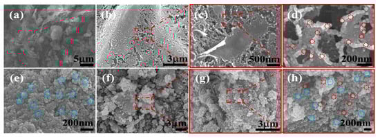 SEM images of (a) mpg-C3N4 nanosheets, (b–d) Pd/mpg-C3N4 nanosheets, (e) pure Fe3O4 nanoparticles, and (f–h) Fe3O4/Pd/mpg-C3N4 nanocomposites. Red circles and blue circles represent individual Pd nanoparticles and Fe3O4 nanoparticles, respectively.