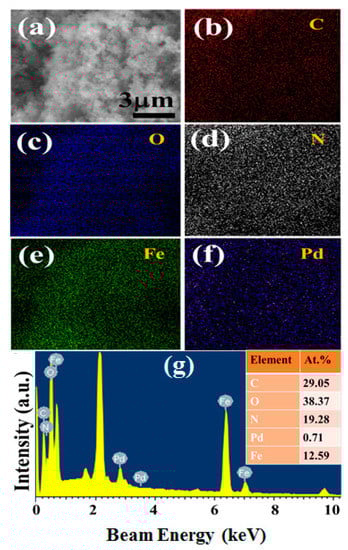 To further assess the elemental distribution and composition of the nanocomposite, SEM-EDX analysis was performed and its result is shown in Figure 2. From the comparison of real SEM image (Figure 2a) with EDX element maps (Figure 2b–f), it is noted that all the elements are uniformly distributed throughout the nanocomposite sample and no elements other than constituents are observed. This result manifests the high compositional purity and homogeniety of Fe3O4/Pd/mpg-C3N4 three-component nanocomposites. Interestingly, the content of Pd NPs is estimated to be only 0.71% for this sample (see the SEM-EDX spectrum in Figure 2g).