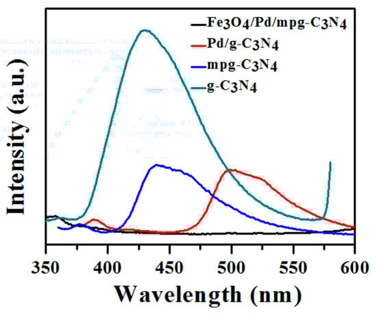 Suppression of carrier recombination is critically required to enhance the photocatalytic activity of a photocatalyst. As a technique to estimate the carrier separation and recombination rate, photoluminescence (PL) measurements were conducted with excitation wavelength at 320 nm. Figure 3 exhibits PL spectra of normal g-C3N4, mpg-C3N4, Pd/mpg-C3N4 hybrid, and Fe3O4/Pd/mpg-C3N4 nanocomposite. The emission peaks of the samples are positioned in the wavelength range of 350–600 nm. The normal g-C3N4 shows a very strong emission peak centered at 430 nm. The intense PL peak indicates that photogenerated charge carriers massively recombine to disappear in this material. From the peak position, the band gap of normal g-C3N4 is calculated at 2.88 eV, which is close to its ideal value (2.7 eV). This moderately large band gap is known to lower its light-absorbing capability []. It is noteworthy that the PL intensity of mpg-C3N4 nanosheets is about 60% lower as compared to normal C3N4, implicating that the high porosity and increased surface area facilitate charge separation. This may be realized because more electrons of photogenerated charge pairs can easily move to larger carrier-depleted surface area. Moreover, a slight red shift of peak position from 430 nm to 440 nm is observed. When the mpg-C3N4 nanosheets are decorated with Pd NPs, the PL intensity decreases more by ~5% and the red shift becomes noticeable. The additional intensity drop is attributed to electron transfer to Pd NPs and the red shift of the peak position may originate from effective band gap reduction by Pd band formation in mpg-C3N4 band. Surprisingly, the PL peak intensity seems negligible in Fe3O4/Pd/mpg-C3N4 nanocomposite. This substantial intensity reduction suggests that photogenerated electrons in mpg-C3N4 nanosheets transfer ultimately to Fe3O4 NPs via Pd NPs and this electron transfer chain works efficiently.