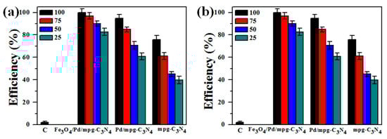 Bacterial degradation efficiency of (a) E. coli and (b) S. aureus with 108 CFU/mL. The efficiency of mpg-C3N4, Pd/mpg-C3N4 hybrids, and Fe3O4/Pd/mpg-C3N4 nanocomposites was estimated at different concentrations (25, 50, 75, and 100 μg/mL) after 2 h of solar light irradiation and magnetic separation. The symbol C represents control sample.