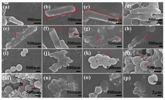 Time-dependent SEM images of E. coli (a–h) and S. aureus (i–p) treated with Fe3O4/Pd/mpg-C3N4 nanocomposites (100 μg/mL) under solar light illumination. (a,i) 0 min, (b,j) 15 min, (c,k) 30 min, (d,l) 45 min, (e,m) 60 min, (f,n) 75 min, (g,o) 90 min, (h,p) 120 min. The red arrows and a circle point damaged parts of bacterial cells.