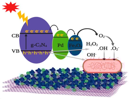 A schematic illustration of photocatalytic antibacterial mechanism of three-component nanocomposites is presented in Figure 6. When solar light is irradiated, a lot of electron–hole pairs are generated in mpg-C3N4 nanosheets []. Immediately, the photogenerated electrons are transferred to Pd NPs, which facilitate charge separation and also act as stepping stones for further electron transfer. Most of electrons coming into the Pd NPs again move to the conduction band of Fe3O4 NPs []. For this reason, the conduction band of Fe3O4 NPs would be a main supplier of energetic electrons. On the other hand, photogenerated holes are left behind in the valence band of mpg-C3N4, due to the energy barrier at interface with Pd NPs. Through these processes, photogenerated charge carriers are well separated, leading to the effective suppression of carrier recombination. Those separated electrons and holes interact with some reactive species such as O2, H2O2, H2O, and OH−. As a result, superoxide anion radicals (·O2−) and hydroxyl radicals (·OH), which have hyper-reactivity and strong oxidation capability, are formed and they attack bacteria. Consequently, the oxidative stress at bacterial surface increases and cell materials are damaged, leading to the cell wall disintegration and malfunction, and ultimately to cell death. Through these correlated mechanisms, the three-component nanocomposites can show enhanced antibacterial activity.