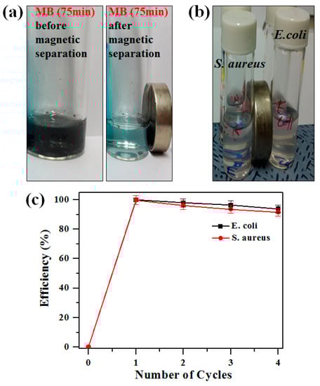 The recovery characteristics and re-usability of photocatalysts were also examined. Due to the strong magnetic property of Fe3O4 NPs, the Fe3O4/Pd/mpg-C3N4 nanocomposites could be easily collected after use, as demonstrated in Figure 7a,b. Figure 7a compares photo images taken before and after magnetic separation of the nanocomposites dispersed in methylene blue solution (10 μM). The images were obtained after irradiating solar light for 75 min. The near-transparent color of the solution confirms that the nanocomposites were completely separated from the solution. The similar and complete magnetic separation of the nanocomposites can also be noticed from bacterial cells, as shown in Figure 7b. To check the recyclability of the nanocomposites, cyclic tests were performed, in which each cycle consisted of photocatalytic bacterial degradation and post-collection of the used nanocomposites. For the tests, the Fe3O4/Pd/mpg-C3N4 nanocomposites were repeatedly used while bacterial suspension was refreshed in each cycle. The nanocomposites recovered after each cycle were first sonicated in 75% ethanol solution to get rid of bound bacterial cells, then washed in sterile 0.85% (wt/vol) saline solution for re-use. Figure 7c displays the cyclic degradation efficiency of the nanocomposites for E. coli and S. aureus. Here, the bacterial cells containing the nanocomposites were illuminated with solar light for 2 h in each cycle. For both bacteria, the change in the degradation efficiency appears to be small. For example, the efficiency drops only by 6% for E. coli after four cycles. This small efficiency change along with the quick and easy magnetic separation of the nanocomposites may ensure good recyclability.