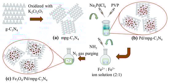 The nanocomposites were synthesized using an easy, reliable, and continuous three-step solution method. As presented in Figure 8, the first step of nanocomposite preparation was to synthesize mpg-C3N4 (see Figure 8a). For this, normal g-C3N4 nanosheets were first prepared by heating melamine at 550 °C for 2 h and ground into fine powder. Then, 500 mg of this powder was chemically oxidized with 8 g of K2CrO7 solution in H2SO4 for 2 h at room temperature under continuous stirring. Next, the solution was diluted with deionized (DI) water and residual acids were removed through washing, centrifuging, and drying at 80 °C. At the second step, Pd NPs were decorated to make heterojunctions with mpg-C3N4 nanosheets by a simple polyol method [], as shown in Figure 8b. In detail, 10 mL of EG was stabilized at 161 °C for 2 h and then 50 mg of mpg-C3N4 was added into EG. Subsequently, 0.432 g of Na2PdCl4 and 0.0832 g of PVP solution in 2 ml of EG was added dropwise over 30 min of time period. The hybrid nanostructure powder was obtained after washing with acetone and drying at 70 °C. At the last step, magnetic Fe3O4 NPs were decorated on this powder using co-precipitation method in inert gas atmosphere (see Figure 8c), following the previously reported procedure []. In order to make Fe3O4/Pd/mpg-C3N4, FeCl2·4H2O and FeCl3·6H2O (molar ratio = 2:1) were dissolved into 100 mL of DI water and heated at 90 °C for 1 h under nitrogen gas flow. Then, 10 mL of 25% ammonia solution was added slowly. Finally, the black product was magnetically separated, washed, and dried to obtain nanocomposite powder.