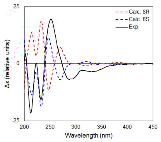 Conformational analyses of each compound were performed with Schrodinger MacroModel []. These conformers were then optimized using DFT, at the B3LYP/6-311+G(2d,p) level in Gaussian 16. At the same time, the zero-point energy, electronic transition, and rational strength of all conformers were calculated. Following this the ECD spectra for each conformer were calculated in Gaussian 16 at the B3LYP/6-311G(2d,p) level []. All DFT calculations were performed using a polarisable continuum model []. The final ECD spectra were produced using the freely available software SpecDis 1.7 (version 1.71, SpecDis, Berlin, Germany) and corrected with the experimental UV spectra [].