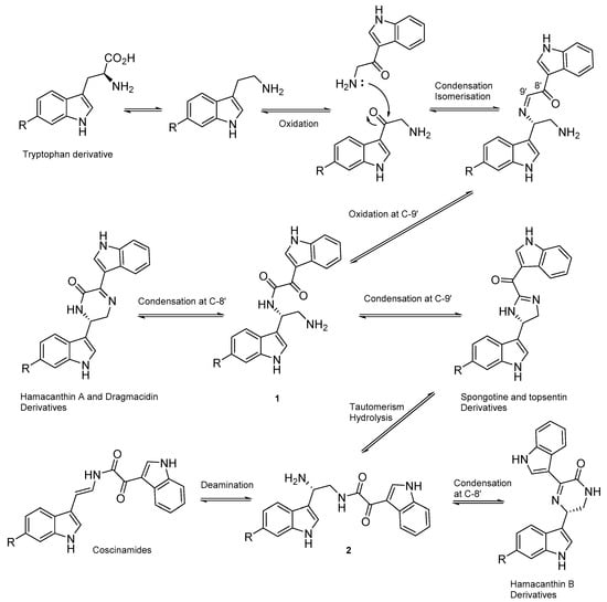Biosynthetic hypothesis for the calcicamide, hamacanthin, coscinamides, and topsentin derivatives.