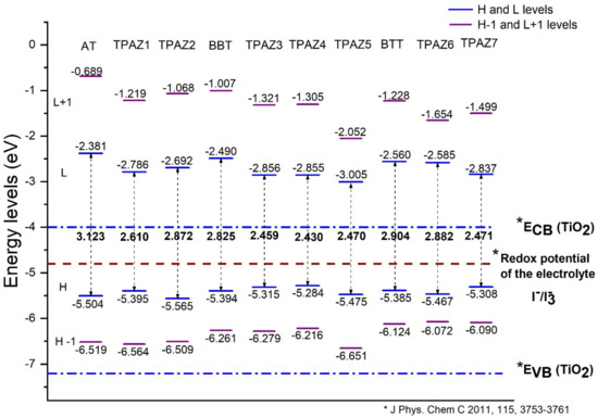 One of the important factors to predict the short-circuit current density (Jsc) is the electron injection efficiency (Øinj), which is influenced by the free energy of electron injection (ΔGinj), that is, Øinj α (−ΔGinj) [7,59,60]; therefore, Øinj is equal to the absolute values of ΔGinj. Thereby, the absolute values of ΔGinj (Øinj) for all dyes are much greater than 0.2 eV, as is shown in Table 3, and according to the literature [60], we can predict that these dyes have enough driving force for the fast injection of excited electrons from dyes to TiO2. The ΔGinj oscillate between −1.23 and −0.68 eV, which is large enough to guarantee an efficient electron injection (AT, BBT, and BTT have been reported with good conversion efficiency [40,41,44]). Besides, if this ΔGinj is too large, it may introduce energy redundancy and result in a smaller open-circuit voltage (Voc) and large thermalization losses [61,62]. Furthermore, ΔGinj increases in the order: AT (−1.28) < BTT (−1.23) < TPAZ6 (−1.17) < BBT (−1.16) < TPAZ7 (−1.07) < TPAZ1 (−1.02) < TPAZ2 (−1.01) < TPAZ4 (−0.92) < TPAZ3 (−0.89) < TPAZ5 (−0.68). The results reflect that all the dyes have good electron injection efficiencies with AT, BTT, TPAZ6, BBT, and TPAZ7 having better electron injection efficiencies. Despite TPAZ4, TPAZ3, and TPAZ5 presenting the lowest electron injection efficiencies, it should be considered that this study considers as a parameter the oscillator strength of λmax; however, these dyes have other absorption bands with a high oscillator strength.