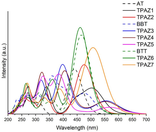 The emission spectra were estimated through vertical excitation energy without considering external iteration calculations (these conditions were chosen taking into account the computational cost). Stokes shift can be consulted in the Supplementary Material (see Figure S1); the results indicate that the studied molecules constitute potential applications in organic light-emitting diodes (OLEDs), except TPAZ1 linking the azomethine group with the donor moiety.