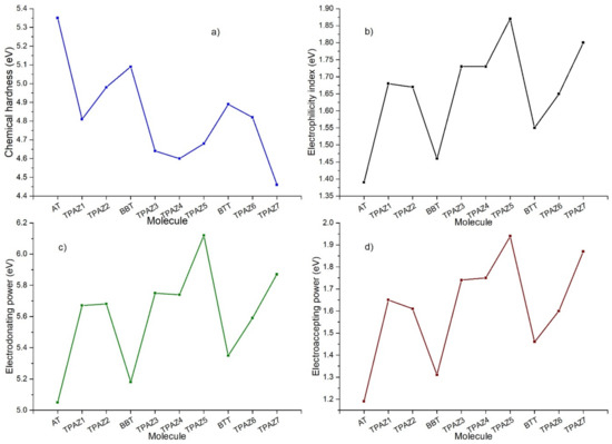 Chemical reactivity parameters were calculated through DFT conceptual using M06/6-31G(d) level of calculation to obtain neutral and ionic energies. Chemical hardness (η), electrophilicity index (ω), electrodonating power (ω−), and electroaccepting power (ω+) were obtained and analyzed. The chemical hardness has been related to the ease with which electrons are transferred through the molecule [67,68]. This parameter, furthermore, has been inversely associated with the conversion efficiency of the DSSC, which is highly supported on correlation calculations between theoretical results of the chemical hardness and experimental data of the efficiency [69]. Likewise, the electrodonating power and electroaccepting power are related to the capacity of the molecule to donate and accept electrons, respectively [70], and the electrophilicity index is related to the stabilizing energy that a system experiences when it is saturated with electrons [71]. Mainly, lower values of chemical hardness are expected to consider the highest efficiency [72]. Furthermore, higher values of electrophilicity and electroaccepting power are expected to consider the highest efficiency in dyes with the modification in the π-bridge (see Figure 5).