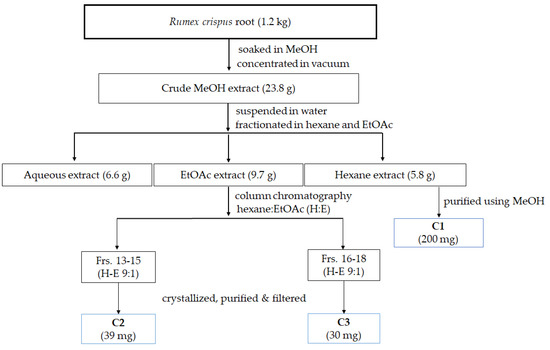Separation of bioactive compounds from Rumex crispus root (RCR) was conducted following the procedure illustrated in Figure 1.