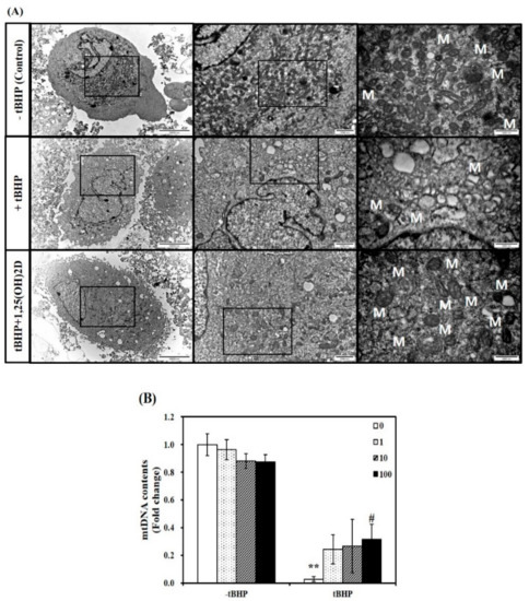 Influence of 1,25-dihydroxyvitamin D (1,25(OH)2D) on mitochondrial morphology and mitochondrial DNA (mtDNA) contents. Transmission electron microscopy (magnification of 7000, 20,000, and 50,000; scale bars = 10, 2, and 1 μm) (A). M demonstrates the position of mitochondria. The mtDNA contents were quantified by qRT-PCR (B). Results are expressed as mean ± SEM from two independent experiments (n = 6 per group). ** p < 0.01 compared to vehicle control. # p < 0.05 compared to tBHP control. Control (-tBHP), vehicle-treated C2C12 muscle cells; + tBHP, 0.1 mM tertiary butyl-hydrogen peroxide-treated myotubes; tBHP + 1,25(OH)2D, pretreatment with 0.1 mM tBHP following 1,25(OH)2D incubation (100 nM, 24 h).