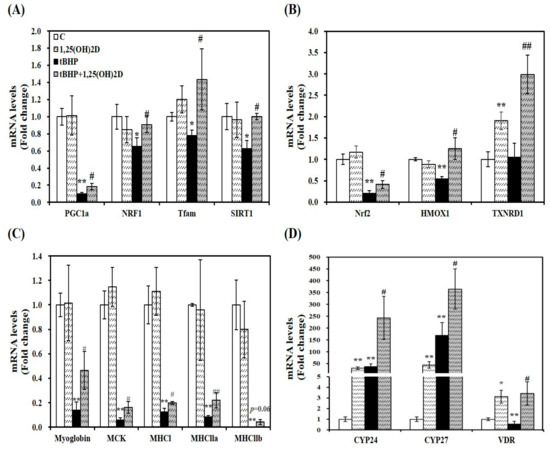 To the best of our knowledge, the present study, for the first time, demonstrates that 1,25(OH)2D ameliorates tBHP-induced oxidative stress, lipid peroxidation, cell damage, and death, as well as mitochondria appearance and mtDNA levels in C2C12 myotubes. In addition, 1,25(OH)2D treatment significantly increases mRNA levels involved in mitochondrial biogenesis, antioxidant enzymes, and muscle differentiation and NAD-associated AMPK/SIRT1 activities in tBHP-treated C2C12 muscle cells. These results suggest that maintaining or improving vitamin D status might be good strategy to prevent muscle oxidative stress and its-relevant health diseases.