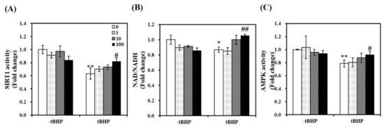 Effects of 1,25-dihydroxyvitamin D (1,25(OH)2D) on AMP-activated protein kinase (AMPK) /sirtulin 1 (SIRT1) activities and the ratio of nicotinamide adenine dinucleotide (NAD) to NADH. AMPK activity (A), SIRT1 activation (B), and NAD/NADH (C) were analyzed by commercial kits, normalized to their relative protein levels, and expressed as the fold change compared to vehicle control. The value of each bar represents mean ± SEM. Experiments represent at least two or three independent experiments (n = 8–10 per group). * p < 0.05, ** p < 0.01 compared to vehicle control. # p < 0.05, ## p < 0.01 compared to tBHP control.