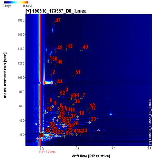 Ion migration spectra of jujube fruits stored for different times at 4 °C. The numbers are identified volatile components.