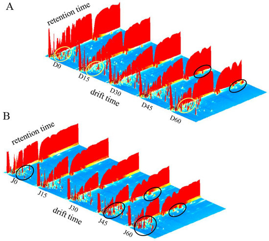 Considering that the 3D spectrum was rough, the overhead view was used for comparison, as represented in Figure 3. Different volatile organic components (VOCs) were different points in the picture, which was highly convenient for observation and analysis. The red vertical line at the abscissa was the reactive ion peak (RIP) at normalized drift times for DZ and JS of 7.79 and 7.81, respectively. The differential contrast model was used to compare the differences among the samples. The fresh sample was selected as the reference, and the spectrum of the other samples deducted the reference. The background after deduction was white showed that the VOCs were the same. Red spots indicate that the content of the substance was higher than the reference, and blue spots indicate that the content was lower than that of the reference. Compared with that of untreated fruits, more red spots are located in the retention time range of 900–1400 s of DZ after storage, and the VOCs changed inconspicuously in the retention time range of 100–600 s at the topographic plot (Figure 3A). For JS, many red spots appeared, and the entire retention time was covered. Especially after 45 days, most of the signals were much higher than that of fresh fruits. This finding indicated that the VOCs of two species varied at different refrigeration times and were affected by variety when the fruits were under similar conditions. Further ripening of the jujube fruits during storage promoted the synthesis of certain volatile components. The formation of fruit flavor was a dynamic process in which the fruit continuously synthesized volatile aroma substances [38]. In the post-harvest ripening stage of bananas, the ester content in the yellow ripening period increased, and the alcohol content in the over-ripe period increased [39].