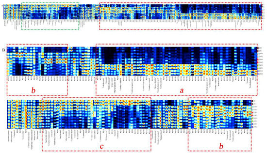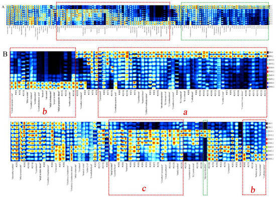 Fingerprint of volatile compounds of Jinsixiaozao samples. (A) Fingerprint of all Jinsixiaozao, (B) two parts of the fingerprint.