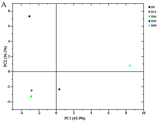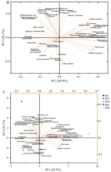 PCA analysis of Dongzao. (A) score plot of the first two principal components, D0, D15, D30, D45, and D60 represent refrigeration for 0, 15, 30, 45, and 60 days, respectively. (B) loading plot of different variances, (C) biplot of PCA.